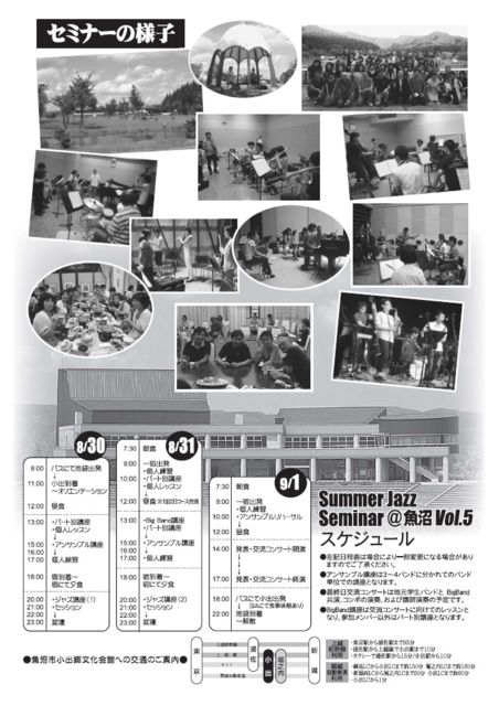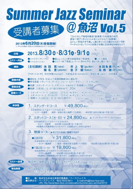 ※ベースフェイスより、ジャズセミナーのご案内をさせていただきます♪ 今年で5回目を数え、益々ご好評をいただいております『Summer Jazz Seminar@魚沼Vol.5』を 今年も大自然の地 新潟県魚沼で開催いたします!! ⇒ http://www.bass-face.com/education/summer_jazz_seminar2013/ 国内外のジャズ・シーンを牽引する 現役一流アーティストを講師陣にお迎えし 先生方そしてジャズを学ぶお仲間とともに過ごす ジャズ三昧の2泊3日。 大自然のおいしい空気の中で、 ジャズをしっかり学びたい方垂涎のジャズセミナーです! 今で