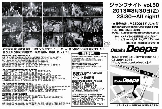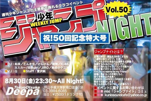 遂に50回記念! 更なる続報は常時書き込み致します。 興奮の夜の記念開催をご予定の上お楽しみに! “ジャンプナイト”は一晩ジャンプ楽曲づくしのお祭りです。 内容、興奮度共に、最高テンションを続け2013年夏も探し物探しに行くのさ! いつもの皆さん、そしてもちろんはじめてご参加の方も大歓迎ですよ。 今回もお誘い合わせの上、ご予定頂けます様よろしくお願いしますね! ☆ご参加の方はこちらも是非一度読んでみて下さいね! http://mixi.jp/view_bbs.pl?id=52923068 特集のリクエストも受け付けております! “ジャン