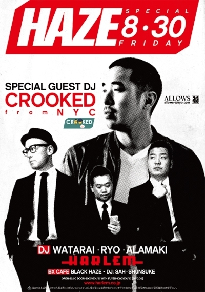 今夜HAZE/Black HAZE at HARLEM/BX CAFEへ行かれる方はこちらでゲスト承ります! 今週はスペシャル!!! NYCからS.K.A.M. ArtistよりDJ CROOKED a.k.a. Korean Blowが来日! 毎週金曜日の鉄板パーティー 『HAZE』 クラブシーンと音楽、アート、ファッション等のカルチャーを発展させ、様々な情報や人種が集まる「NEW YORK」を強くイメージ。 WATARAI、RYO、ALAMAKIが「TOKYO」に本物の ”The Club” を創り上げる。 『Black HAZE』 BX CAFEでしか出来ないLUXURYな空間演出の中で、BLACK MUSICが持つ醍醐味を最大限に味わう事が出