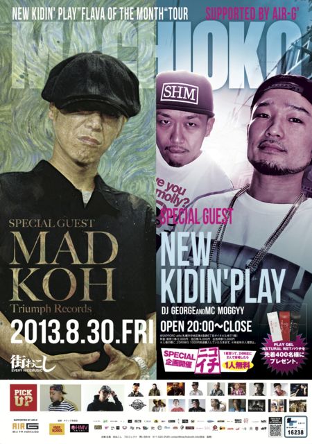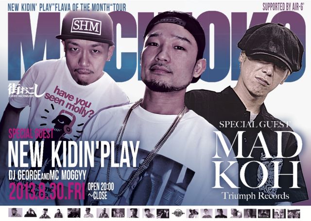管理人様告知失礼します。 街おこし 2013.08.30 SPECIAL GUEST NEW KIDIN' PLAY(DJ GEORGE&MC MOGGYY) MAD KOH http://www.youtube.com/watch?v=tSdKLsG_e-s 9,000名突破記念!! 8月:月見月 2013年は、毎月最終金曜日@SAPPORO alifeで開催の街おこしをはじめとし、道内各地での街おこし、毎週月曜日のJOIN THE CLUB、ダンスイベント ICEAGEなど様々な企画を行い、沢山の皆様のご理解・ご協力、ご来場により、動員数が、9,000名を突破いたしました。(7月度予想も含む)ありがとうございます。 マチオコ史上最速の記録
