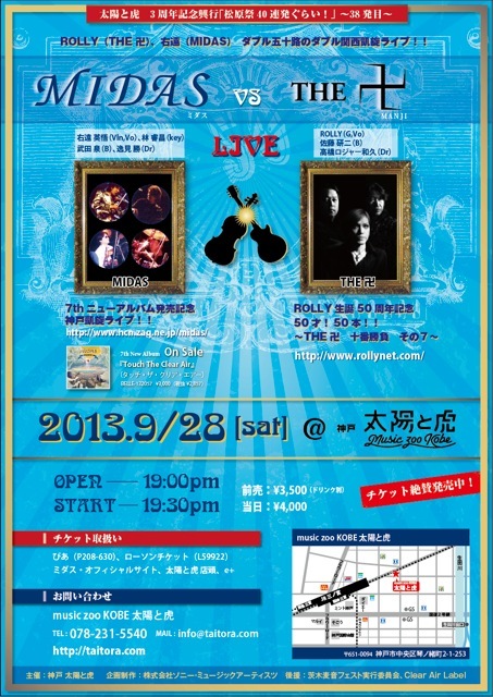 ご存知のように9/22(日)〜23(祝)は野外ロック・イヴェント“茨木麦音フェストVol.2”に出演いたしますが、その数日後の9/28(土)には表題通り神戸「太陽と虎」に出演いたします。 共演はローリー寺西(ROLLY)率いるTHE 卍。 ROLLYの実力とマニアックさ加減は既にご承知の通りでしょうが、この卍、他の二人がまた敏腕揃いですさまじい。ベースはマルコシアスバンプの佐藤研二氏。太鼓はX-RAYのロジャー高橋氏。 さてさてどんなライヴになるのやら・・・乞うご期待。 皆さまもすこぶるお忙しいでしょうが、きっとご満足頂ける内容になろう