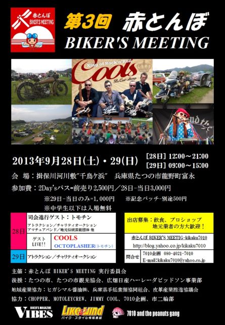 【第3回 赤とんぼ BIKER'S MEETING 2013】 開催日時:2013年9月28日(土)・29(日) [28日] 12:00〜21:00 [29日] 09:00〜15:00 会 場:揖保川河川敷"千鳥ケ浜" 兵庫県たつの市龍野町富永 参 加 費:2Day'sパス=前売り2,500円/28日-当日3,000円 ※29日-当日のみ=1,000円 ※記念パッチ-別途500円 ※中学生以下は入場無料 [28日] 司会進行ゲスト:トモチン アトラクション/チャリティオークション アマチ