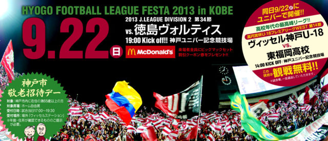 13年 Jリーグ ディビジョン2 第34節 ヴィッセル神戸 対 徳島ヴォルティス ○会場/アクセス 神戸総合運動公園ユニバー記念競技場 〒654-0163 神戸市須磨区緑台 「新神戸」駅、「三宮」駅より神戸市営地下鉄西神・山手線「西神中央」行で「総合運動公園」下車徒歩5分 ○今年の戦績 第33節を終了して21勝7敗5引き分け http://www.vissel-kobe.co.jp/match/ ○ピンポイント天気予報 http://weather.yahoo.co.jp/weather/jp/leisure/soccer/28/33038.html ○TV中継情報 http://www.vissel-kob