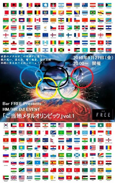 マスターから、突然「今度ご当地メタル大会するから隊長に任命してええか?」とコメントが入って動き出した企画。 ↑てかせたっぷくんの名言「気が付けば全部ロシアから選んでました」を聞いてから 暖めてて今回の東京オリンピックに完全に便乗した形となりますw タイトルはそのまんま、「ご当地メタルオリンピック(仮)」にとりあえずしてみました。このダサい感じがメタルっぽいやないですか?w ってなわけで。 FREEを盛り上げよう企画でもあるw HM/HR DJ EVENT「ご当地メタルオリンピック」vol.1 日時:2013/09/27(金)