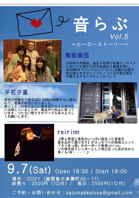 9月7日(土)開場 18:30〜 開演 19:00〜 場所:COZY(鹿児島市高麗町30−17) 料金:前売り券:2000円 当日券:2500円(1ドリンク付き) 出演:風街楽団/平石夕喜/reirinn 風町楽団さん 平石夕喜さん の詳しい情報はこちらをご覧くださいね→http://satumakko.chesuto.jp/e1007060.html ♪ お気軽にコメント書き込みもしてください ♪