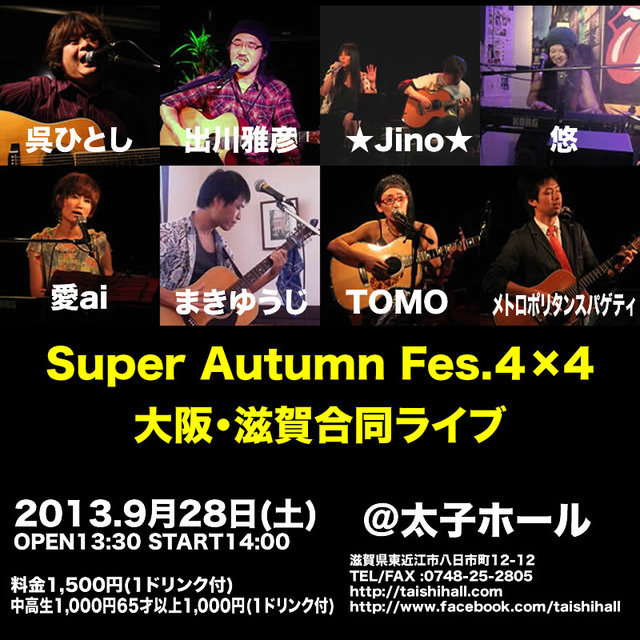 £¹/£²£¸(ÅÚ) ¡ú¼¢²ì¡ÖÂÀ»Ò¥Û¡¼¥ë¡× http://taishihall.com ¼¢²ì¸©Åì¶á¹¾»ÔȬÆü»ÔÄ®12-12 TEL/FAX :0748-25-2805 ³«¾ì13:30³«±é14:00 ÎÁ¶â1,500±ß(1¥É¥ê¥ó¥¯ÉÕ) Ãæ¹âÀ¸1,000±ß(1¥É¥ê¥ó¥¯ÉÕ) ¡ÁSuper Autumn Fes.£´¡ß4¡Á Âçºå¡¦¼¢²ì¹çƱ¥é¥¤¥Ö ¢£½Ð±é ¡ÚÂçºå¡Û ¡úJino¡ú ¸â¤Ò¤È¤· ½ÐÀî²íɧ ͪ ¡Ú¼¢²ì¡Û °¦ai ¤Þ¤¤æ¤¦¤¸ TOMO ¥á¥È¥í¥Ý¥ê¥¿¥ó¥¹¥Ñ¥²¥Æ¥£ ¡úJino¡ú¡¢¿Ø¤µ¤ó¤¬²¹¤á¤Æ¤¿´ë²è¤¬¼Â¸½¡ª ÂçºåÀª¤Ë²¬»³¤ÈÆàÎɤ¬º®¤¶¤Ã¤Æ¤Þ¤¹¤¬¸æ°¦ÕÈ¡°¡° Ã뤫¤é¤Î¥é¥¤¥Ö¤Ê¤Î¤Ç¡¢°ì½ï¤ËÂǤÁ¾å¤²¤Þ¤Ç¤¤¤«