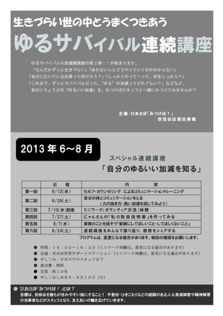 開催日時 2013年9月4日(水) 18:30〜21:30 開催場所 Alternative Space Necco 2F 東京都新宿区西早稲田2-18-21 ハシバビル202 参加費:無料 司会進行:山本純一郎(にゃんまげ) Necco IT広報アドバイザー・世田谷区受託事業「みつけば!」ピアサポーター 今回の水曜勉強会は、9月13日(金)に行われる世田谷区主催のイベント 「成人期発達障害の支援のあり方を考えるシンポジウム」に向けた アンケートを兼ねたプレイベントとして開催いたします。 東京都自閉症協会とNeccoが関わり、世田谷若者サポートステーションで行われている世田谷区