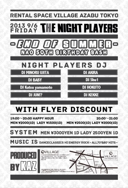 9/6(金)第15回 『 THE NIGHT PLAYERS END OF SUMMER & NAO 50TH BIRTHDAY BASH』記念イベントを『麻布十番VILLAGE』で開催します。