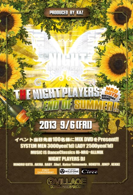 2013夏の終わりに、真夏の熱い夜を存分に肌で感じられる最高にGoodなSoundをCoolに NIGHT PLAYERS DJが皆様にお届け致します。