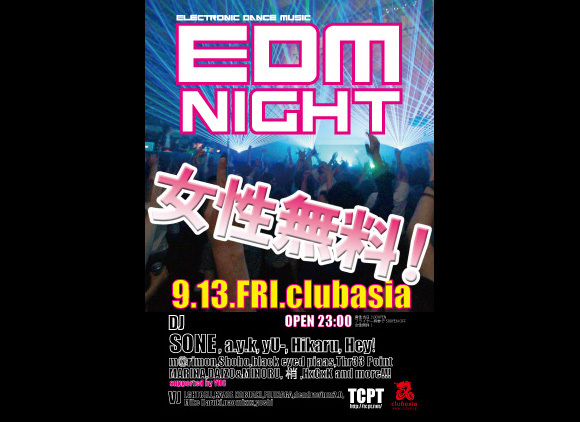 TCPT/EDM SUNDAY presents EDM PARTY EDM NIGHT-½÷À̵ÎÁ!- venue : ½Âëclubasia open : 23:00¡Á genre :EDM DISCOUNT:½÷À̵ÎÁ¡ªÃËÀ2000yen/1D ¡ù¥Ç¥£¥¹¥«¥¦¥ó¥È¡¢¥á¥Ã¥»¡¼¥¸¤Ë¤Æ¼õÉÕÃæ¡ª¡ù David Guetta¤äAvicii,Afrojack,Skrillex,TJR,Lazy Rich,Lucky DateÅù¤¬À¤³¦Åª¤Ë²»³Ú³×Ì¿¤òµ¯¤³¤· º£¡¢À¤³¦Ãæ¤Î²»³Ú¥·¡¼¥ó¤ÎÏÃÂê¤òÆÈÀꤷ¤Æ¤¤¤ë²»³Ú¥¸¥ã¥ó¥ë¡ÖEDM¡×¤Ë¥¹¥Ý¥Ã¥È¤ò¤¢¤Æ¤¿NEW PARTY¡ÖEDM NIGHT¡×! 4·î¤ÎÂè°ì²óÌÜ¡¢¤½¤·¤Æ7·î¤ÎÂèÆó²óÌܤηã¤â¤ê¡¢ÂçÀ¹¶·¤Ã¤×¤ê¤Ïµ²±¤Ë¿·¤·¤¤¡£ º£²ó¤â½÷À¤ÏÁ´°÷Æþ¾ì̵ÎÁ¡ª¡ª¡ª¶âÍˤÎÌë¤Ëcl