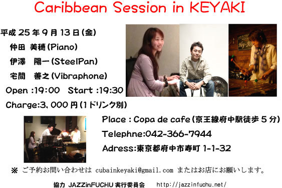 °Ëß·Í۰줵¤ó¤Î¥é¥¤¥Ö¾ðÊó¤Ç¤¹¡£ ¥¹¥Æ¥£¡¼¥ë¡¦¥Ñ¥ó¡¢¥Ó¥Ö¥é¥Õ¥©¥ó¡¢¥Ô¥¢¥Î¤È¤¤¤¦ÄÁ¤·¤¤ÁȤ߹ç¤ï¤»¡£ ¥Ó¥Ö¥é¥Õ¥©¥ó¤È¥¹¥Æ¥£¡¼¥ë¡¦¥Ñ¥ó¤È¥Ô¥¢¥Î¤Î¥È¥ê¥ª¤¬¤É¤Î¤è¤¦¤ÊSOUND¤ò¶Á¤«¤»¤ë¤Î¤«¡¢Ê¹¤Æ¨¤»¤Þ¤»¤ó¡£ ¤ª³Ú¤·¤ß¤Ë¡ª¡ª Caribbean Session in KEYAKI Ê¿À®25ǯ9·î13Æü¡Ê¶â¡Ë ¡¡ ÃçÅÄ ÈþÊæ¡ÊPiano) °Ëß·¡¡ÍÛ°ì¡ÊSteelPan) Âð´Ö¡¡Á±Ç·¡ÊVibraphone) Open :19¡§00 Start :19:30 Charge:3¡¤000±ß¡Ê1¥É¥ê¥ó¥¯ÊÌ¡Ë Place : Copa de cafe(µþ²¦ÀþÉÜÃæ±ØÅÌÊâ5ʬ¡Ë Telephne:042-366-7944¡¡ Adress:ÅìµþÅÔÉÜÃæ»Ô¼÷Ä®1-1-32 ͽÌó