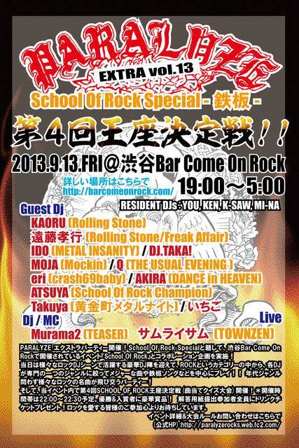 ¥¹¥È¡¼¥ó¤Î¥¹¥¿¥Ã¥Õ¤Î³§Íͤ¤¤Ä¤â¤ªÀ¤ÏäˤʤäƤ¤¤Þ¤¹¡£¥¹¥È¡¼¥óKAORU&±óÆ£¹§¹Ô»á¥²¥¹¥È½Ð±é¤¹¤ë¥¤¥Ù¥ó¥È¤Î¹ðÃμºÎ餷¤Þ¤¹¡£ ¢¢¢£¢¢PARALYZE¡¡EXTRA Vol.13¢¢¢£¢¢ ¡ÁSchool Of Rock Special-Å´ÈÄ-¡Á ¡ÚÆü»þ¡Û¡§9·î13Æü(¶â)19¡§00¡Á5¡§00 ¡Ú¾ì½ê¡Û¡§½ÂëBar Come On Rock ¾Ü¤·¤¤¾ì½ê¤Ï¤³¤Á¤é¤Ç http://barcomeonrock.com/ ¡ÚÎÁ¶â¡Û¡§Æþ¾ì¥Õ¥ê¡¼ ¡ÚGUEST DJ¡Û KAORU(Rolling Stone) ±óÆ£¹§¹Ô(Rolling Stone/Freak Affair) IDO(METAL INSANITY) DJ.TAKA! MOJA(Mockin) Q(THE USUAL EVENING ) ERI(crash¡ú69¡úbaby) A