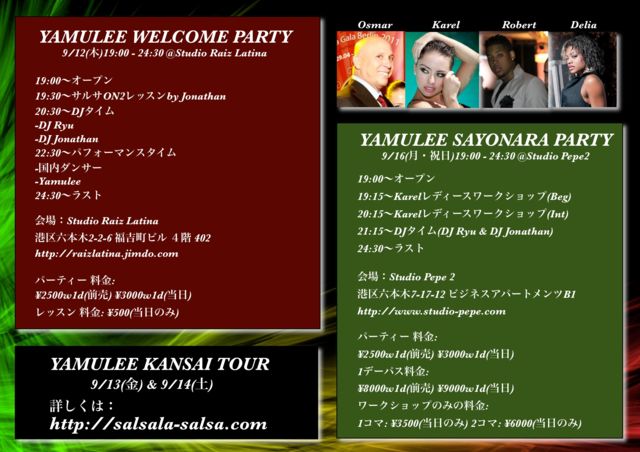 ★TOKYO MAMBO FESTA 2013★ 世界的に有名なトップダンサーチームYamulee Dance Campanyを招き、マンボのビッグなイベントです!もちろんバチャータ、メレンゲ、などオールラテンを楽しめます! 出演者大募集中です。興味のある方気軽にお問い合わせ下さい! mambo.festa@gmail.com ◆日時:9/15(日・祝日前) 13:30-22:30 ◆会場:SEAVANS HALL 東京都港区芝浦1-2-2 シーバンス ア・モール3F Tel :03-5730-0277 http://www.seavanshall.jp/ ◆料金: パーティー \4000w1d(前売り) \4500w1d(当日) 1デーパス (パーティ