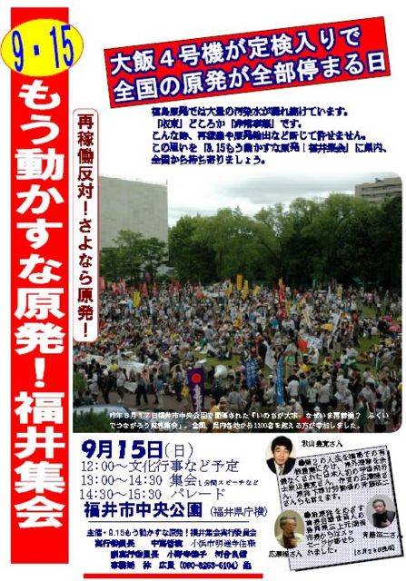 9月15日、大飯4号機が定検入りで全国の原発が全部停まる日 福島原発では大量の汚染水が漏れ続けています。「収束」どころか「非常事態」です。 こんな時、再稼働や原発輸出など断じて許せません。 この思いを「9.15もう動かすな原発!福井集会」に県内、全国から持ち寄りましょう。 ★☆★☆★☆★☆★☆★☆★☆★☆★☆★☆★☆ 9.15もう動かすな原発!福井集会 9月15日、大飯原発が定期検査に入り、再び、原発ゼロの日本を取り戻します。 その日、「9.15 もう動かすな原発! 福井集会」を開催します。 ぜひ、み