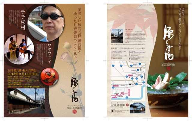 奈良の五條新町でゴンチチでおなじみのチチ松村さんをメインアクトに、 歌とテルミンとギターそして秋の味覚も楽しめる素敵な夕べが開催されます。 ふらり旅とともに是非お立寄くださいませ。 ↓↓ 2013年9月15日(日曜):五條 源兵衛・秋の音楽会 (限定50名 申込み受付中) http://genbei.info/ ■出演:チチ松村(ゴンチチ)・ワタフェイ ■前売り:3,000円 当日:3,500円 ■問合わせ先:0747-23-5566(五條 源兵衛) ■予約先:E-mail gojo@genbei.info ■開催時刻:OPEN・14:30 PLAY・15:00 ■五條 源兵衛のスペシャル1フード