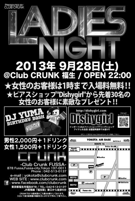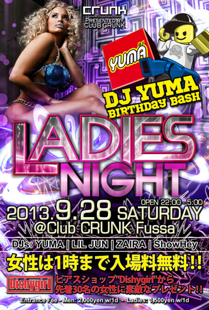 Âè»Í½µÌܤÎÅÚÍËÆü¤Ï"Ladies Night"!! Ĺǯ³¤¯¤³¤Î¥¤¥Ù¥ó¥È¤Ç¤Ï½÷À¤Î¤ªµÒÍͤϰì»þ¤Þ¤Ç´°Á´¤ËÆþ¾ì̵ÎÁ!! ¥ì¥Ç¥£¡¼¥¹¥Ô¥¢¥¹¥·¥ç¥Ã¥×"DISHY GIRL"¤µ¤ó¤Î¶¨»¿¤Î¸µ¡¢½÷À¤Î¤ªµÒÍͤËÍÍ¡¹¤Ê¥×¥ì¥¼¥ó¥È¤ò¤´ÍѰդ·¤Æ¤ª¤ê¤Þ¤¹!! º£·î¤ÏMIXCD "RIDE"¤Ï¤â¤Á¤í¤ó¤Î»ö¡¢Á´¹ñŪ¤Ë³èÌöÃæ¤Î"DJ YUMA"¤Î¥Ð¡¼¥¹¥Ç¡¼¥Ñ¡¼¥Æ¥£¡¼¤â³«ºÅ¤·¤Þ¤¹!! ÉÔÄê´ü¤Ë¥¹¥Ú¥·¥ã¥ë¥¤¥Ù¥ó¥È¤ò³«ºÅ¤¹¤ëÅù¡¢CRUNK¤ÇºÇ¤âÌܤ¬Î¥¤»¤Ê¤¤ÃíÌÜ¥¤¥Ù¥ó¥È!! ¨¬¨¬¨¬¨¬¨¬¨¬¨¬¨¬¨¬¨¬¨¬¨¬¨¬¨¬ Presented by Club CRUNK "Ladies Night" ¨¬¨¬¨¬¨¬¨¬¨¬¨¬¨¬¨¬¨¬¨¬¨¬¨¬¨¬ 2013.9/28 (ÅÚ)