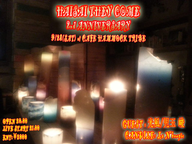 ²¼ËÌÂô¤Î¥Ï¥ó¥â¥Ã¥¯¤ÇÍɤì¤Ê¤¬¤é²»³Ú¤ä¤ª¼ò¤ò´®Ç½¤Ç¤¤ëCafe Hammock Tribe¤Ë¤Æ¡¢ ¥¥ã¥ó¥É¥ë¤ÎÅô¤ê¤ËÊñ¤Þ¤ì¤¿¶õ´Ö¤Ç¤Î ¸÷É÷¡õ»ù¶Ì½Ô¥¢¥³¡¼¥¹¥Æ¥£¥Ã¥¯¥é¥¤¥Ö¡ª ¡ÖHAISAI THEY COME 2nd ANNIVERSARY ¡× 2013ǯ9·î28Æü¡ÚÅÚ¡Û OPEN 20:00 LIVE START 21:00 ENT:2000±ß GUEST LIVE: ¸÷É÷¡Ê¸÷É÷¡õGREEN MASSIVE/COOL WISE MAN¡Ë http://www.youtube.com/watch?v=dyaRZwsV5V0 »ù¶Ì½Ô¡Ê¥Ð¥»¥ë¥Ð¥¸¥ç¥ó¡Ë http://www.youtube.com/watch?v=LV-VU3-8pHE ¥¥ã¥ó¥É¥ë:La N'bougie CAFE Hammock Tribe( µì ½ô¹ñ̡ͷ¼ò