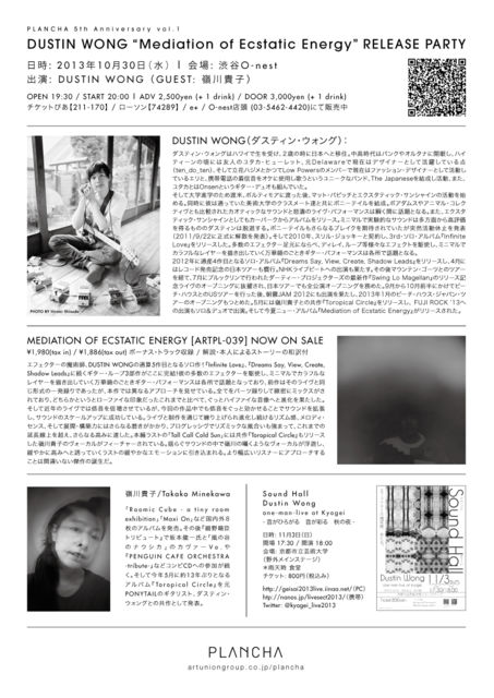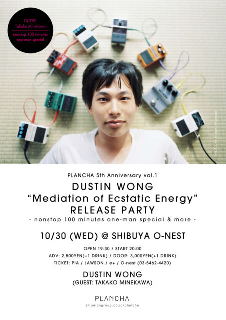 PLANCHA5周年企画の第一弾は、DUSTIN WONGのギター・ループ手法3部作の最終章『Mediation of Ecstatic Energy』のレコ発です。現時点でのキャリアの集大成ともいえる本作の発売を記念してのこちらのイベント、100分ノンストップのワンマン公演にて行います。また、作品にも参加されている、嶺川貴子さんもヴォーカルでゲスト出演していただきます。