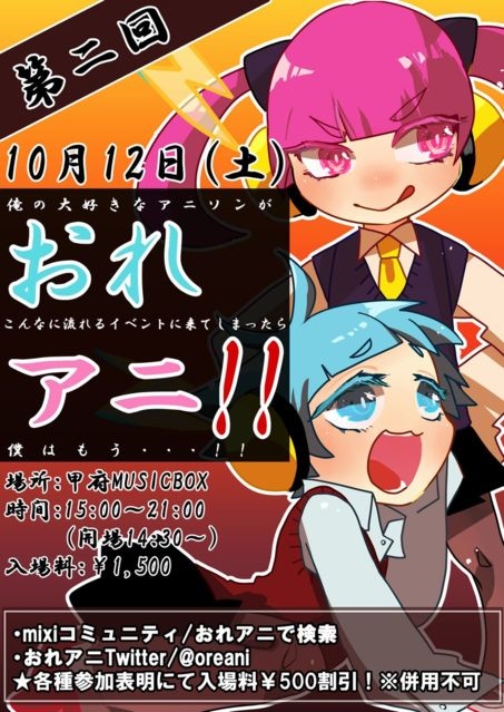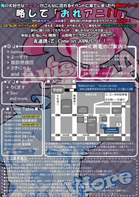 ¥¢¥Ë¥½¥ó·Ï¥ª¡¼¥ë¥¸¥ã¥ó¥ë¥¯¥é¥Ö¥¤¥Ù¥ó¥È ¡Ø²¶¤ÎÂç¹¥¤¤Ê¥¢¥Ë¥½¥ó¤¬¤³¤ó¤Ê¤Ëή¤ì¤ë¥¤¥Ù¥ó¥È¤ËÍè¤Æ¤·¤Þ¤Ã¤¿¤éËͤϤ⤦¡¦¡¦¡¦¡ª¡ª¡Ù ά¤·¤Æ¡Ø¤ª¤ì¥¢¥Ë!!¡Ù ¤ä¤é¤»¤ÆÄº¤¤Þ¤¹Â裲²ó¡ª ¥¢¥Ë¥½¥ó¡¢¥²¡¼¥½¥ó¤«¤éÈþ¾¯½÷¥²¡¼¥à³Ú¶Ê¤Þ¤Ç ¤Þ¤¿¤Þ¤¿¤ä¤Ã¤Á¤ã¤¦£¶»þ´Ö¡ª ¶Ç¤Î¿åÊ¿Àþ¤Ë¾¡Íø¤ò¹ï¤ó¤Ç¤¤¤ë¤½¤³¤Î¥¢¥Ê¥¿¤â °ì¼í¤ê¤¤¤³¤¦¤¼¤È´èÄ¥¤Ã¤Á¤ã¤Ã¤Æ¤ë¤½¤³¤Î¼í¿Í¤µ¤ó¤â ¤¼¤Ò¤¼¤ÒÍ·¤Ó¤ËÍè¤Á¤ã¤Ã¤Æ²¼¤µ¤¤¡ª ¡Ú¸ø¼°Twitter¡Û¡¡https://twitter.com/oreani *Æü¡¡¡¡ »þ* £²£°£±£³Ç¯£±£°·î£±£²Æü¡ÊÅÚ¡Ë 15¡§00¡Á21¡§00 ¡Ê³«¾ì 14¡§30 ¡Ë *¾ì¡¡