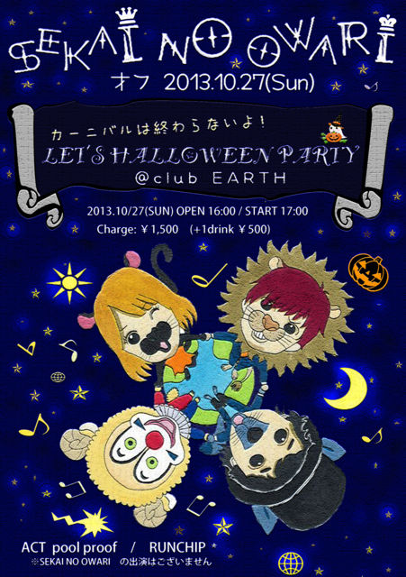 µîǯ¤Î10·î20Æü¤Ëclub EARTH¤Ç¥»¥«¥ª¥ï³ØÀ¸¥ª¥Õ²ñ¤ò¼çºÅ¤µ¤»¤Æ¤¤¤¿¤À¤¤¤Æ¤«¤é1ǯ¤¬·Ð¤Ã¤Á¤ã¤¤¤Þ¤·¤¿¤¬¡¢ ¤ß¤ó¤Ê¤ªÂÔ¤¿¤»¤Á¤ã¤ó¤Ç¤·¤¿ º£²ó¤âclub EARTH¤Î¥¹¥¿¥Ã¥Õ¤ÎÁ´Ì̥Х寥¢¥Ã¥×¤Î¤â¤È¡¢¥»¥«¥ªÎØ¥ª¥Õ¤ò ¡ÖSEKAI NO OWARI¡×(À¤³¦¤Î½ª¤ï¤ê)¤¬ºî¤ê¾å¤²¤¿club EARTH¤Ç³«ºÅ¤·¤Á¤ã¤¤¤Þ¤¹¤Ã Âꤷ¤Æ¡¦¡¦¡¦ SEKAI NO OWARI¥ª¥Õ¡Ö¥«¡¼¥Ë¥Ð¥ë¤Ï½ª¤ï¤é¤Ê¤¤¤è¡ªLet's HALLOWEEN PARTY @ club EARTH¡× ¡Ö±ê¤È¿¹¤Î¥«¡¼¥Ë¥Ð¥ë¡×¤Ë»²À路¤¿¤ß¤Ê¤µ¤ó¤É¤¦¤Ç¤·¤¿¤«¡© Ëâ½÷¤ä¥¢¥ê¥¹¡¢¥ß¥¤¥éÃË¡¢¥¦¥µ¥®¡¢Éٻλ³¡©¡¦¡¦¡¦¤È»×¤¤»×¤¤¤ÎÊÑÁõ