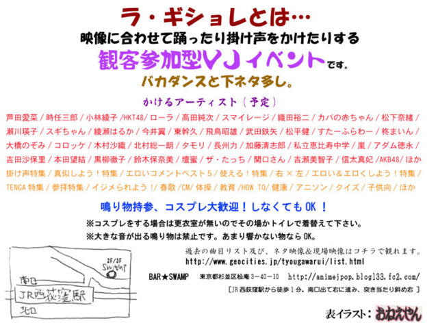 ÎÁ¶â¡§£±£µ£°£°±ß(1¥É¥ê¥ó¥¯ÉÕ¤) ¥é¡¦¥®¥·¥ç¥ì¤È¤Ï¡Ä ±ÇÁü¤Ë¹ç¤ï¤»¤ÆÍ٤俤ê³Ý¤±À¼¤ò¤«¤±¤¿¤ê¤¹¤ë´ÑµÒ»²²Ã·¿VJ¥¤¥Ù¥ó¥È¤Ç¤¹¡£ ¥Ð¥«¥À¥ó¥¹¤È²¼¥Í¥¿Â¿¤·¡£ ¤«¤±¤ë¥¢¡¼¥Æ¥£¥¹¥È(ͽÄê) ¹âÅĽ㼡/¾¾Ê¿·ò/µÈÅĺ»ÊÝΤ/¾¾²¼Æà½ï/µµ¼¡Ïº/¥í¡¼¥é/ÃÅ̪/°½À¥¤Ï¤ë¤«/¥¿¥â¥ê/¥¹¥®¤Á¤ã¤ó/Çú¾ÐÌäÂê/É¢¤Þ¤¤¤ó/Æ£°æÎèÆà/¥³¥í¥Ã¥±/Íò/ÌÚ¼º»¿¥/Ë̼Áí°ìϯ/»äΩ·ÃÈæ¼÷Ãæ³Ø/ÈôÄ»¾¼Íº/¹õÌøÅ°»Ò/¥¢¥À¥àÆÁ±Ê/ÎëÌÚÊÝÆàÈþ/´Ø¸ý¤µ¤ó/À¥Àî±Í»Ò/Perfume/Åì´´µ×/Daigo/°²ÅݦºÚ/ËÜÅÄ˾·ë/¿®ÂÀ¿¿ÈÞ/¤¹¤¿¡¼¤Õ¤é¤ï¡¼/»þǤ»°Ïº/¾®ÎÓ°½»Ò/HKT48/AKB48/¥«¥Ð¤ÎÀÖ¤Á¤ã¤ó/¿¥ÅÄ͵Æó/