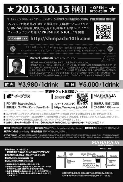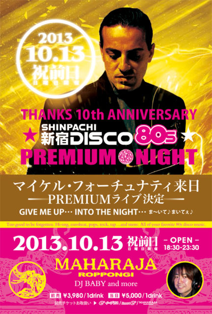 ¥Þ¥¤¥±¥ë¡¦¥Õ¥©¡¼¥Á¥å¥Ê¥Æ¥£ÍèÆü -PREMIUM¥é¥¤¥Ö·èÄê- GIVE ME UP¡Ä INTO THE NIGHT¡Ä ¤Þ¡Á¤¤¤Æ¢ö¤Þ¤¤¤Æ¤§¢ö ¡ØTHANKS 10th ANNIVERSARY SHINPACHI¿·½ÉDISCO80s PREMIUM NIGHT¡Ù 2013ǯ10·î13Æü¡¡½ËÁ°Æü¡¦ÆüÍËÆü³«ºÅ OPEN/18:30-23:30 PLACE/MAHARAJA ROPPONGI DJ/BABY and more Too good to be forgotten. Hi-nrg, eurobeat, pops, rock, rap¡Äand more. All of your favorite 80s disco music. ¥Þ¥Ï¥é¥¸¥ã¤ÎËè·îÂè2ÆüÍËÆü¤Ë³«ºÅÃæ¤Î80ǯÂå¥Ç¥£¥¹¥³¥¤¥Ù¥ó¥ÈSHINPACHI¿·½ÉDISCO80s¤Î10¼þǯ¤òµÇ°¤·¡¢¥Þ¥¤¥±¥ë¡¦¥Õ¥©¡¼¥Á¥å¥Ê¥Æ