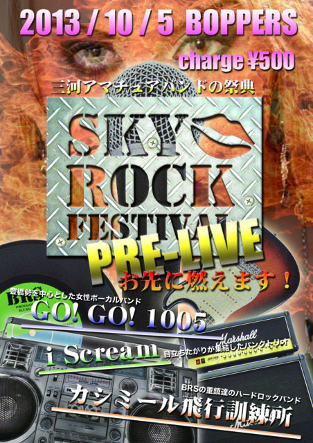 SKY ROCK FESTIVAL PRE-LIVE ¤ªÀè¤Ëdz¤¨¤Þ¤¹¡ª 2013/10/05 (SAT) 19:00 START charge \500 ¡ù¡¡GO!GO!1005 ¡¡¡¡(˶¶Àª¤òÃæ¿´¤È¤·¤¿½÷À¥Ü¡¼¥«¥ë¥Ð¥ó¥É¡Ë ¡¡¡¡ ¡ù¡¡¥«¥·¥ß¡¼¥ëÈô¹Ô·±Îý½ê ¡¡¡¡¡ÊBRS¤Î½ÅÄÃã¤Î¥Ï¡¼¥É¥í¥Ã¥¯¥Ð¥ó¥É¡Ë ¡¡¡¡ ¡ù¡¡i Scream ¡¡¡¡¡ÊÌÜΩ¤Á¤¿¤¬¤ê¤¬½¸·ë¤·¤¿¥Ñ¥ó¥¯¥È¥ê¥ª¡Ë