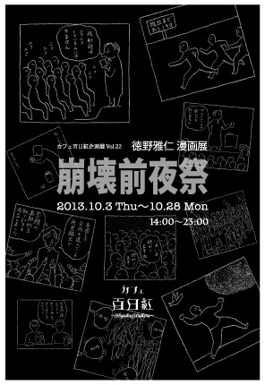 カフェ百日紅企画展Vol.22 徳野雅仁 漫画展 「崩壊前夜祭」 10月3日(木)〜10月28日(月) 本展示用に描き下ろした新作四コマ漫画展示です。 徳野雅仁四コマ漫画集先行発売決定。 ※特別対談イベント 徳野雅仁×キャリー・エンパイア 「音楽カフェ〜パンクからアイドルまで〜」 徳野先生の音楽の引き出しを イラストレーターのキャリー・エンパイアが 開けちゃいます!! 10月18日(金)19:00 open、19:30 start 料金 ¥1,500(税込み、1ドリンク付き) 予約不要 *****************************