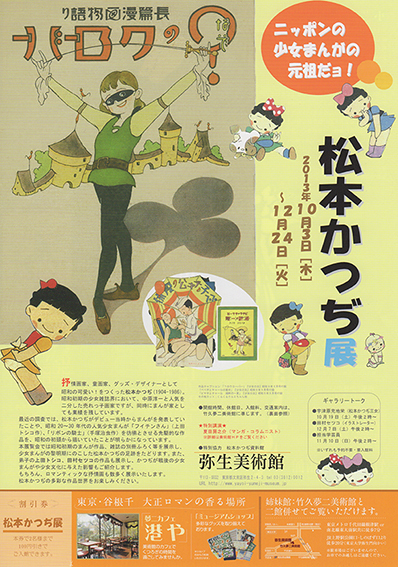 秋一番の展覧会のおしらせで〜〜す^^ 今年の春から夏にかけて兵庫県でおこなわれました『松本かつぢ展』に続いて、 この秋は東京は根津にあります『弥生美術館』での展覧会です。 題しまして『ニッポンの少女まんがの元祖だよ!』松本かつぢ展 今回はかつぢの描いた漫画の数々に焦点を定めた珍しい展示になっております。 中でも昭和9年に描かれた『?(なぞ)のクローバー』は大変貴重な漫画で、 漫画コラムニストの夏目房之介先生の特別講演も(要予約)予定されています。 その他『かつぢ』描く多彩な世界をお楽しみ頂ける企