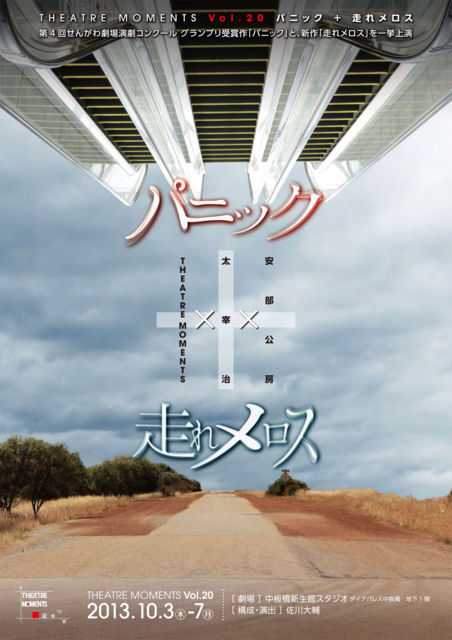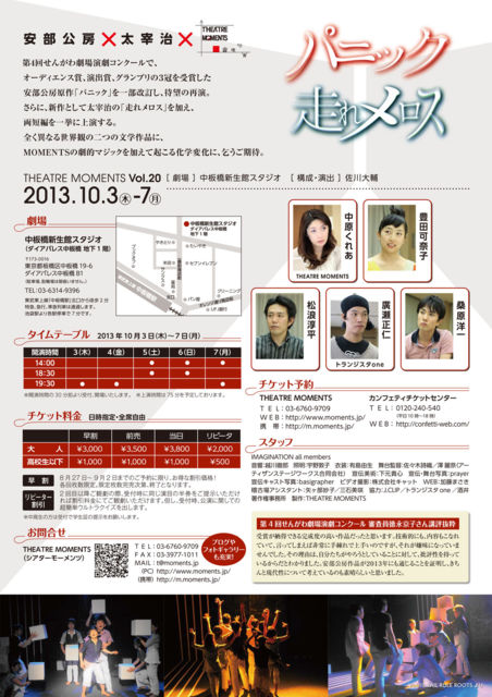せんがわ劇場演劇コンクール2013で、オーディエンス賞、演出賞、グランプリの3冠を受賞した安部公房原作「パニック」を一部改定し、待望の再演 THEATRE MOMENTS Vol.20「パニック+走れメロス」 演出:構成 佐川大輔 安部公房 ×太宰治×THEATRE MOMENTS 安部公房原作「パニック」を一部改定し、待望の再演。さらに、新作として太宰治の「走れメロス」を加え、両短編を一挙に上演する。 全く異なる世界観の二つの文学作品にMOMENTSの劇的マジックを加えて起こる化学的変化に、乞うご期待。 キャスト 廣瀬正