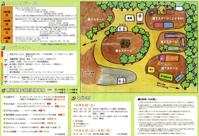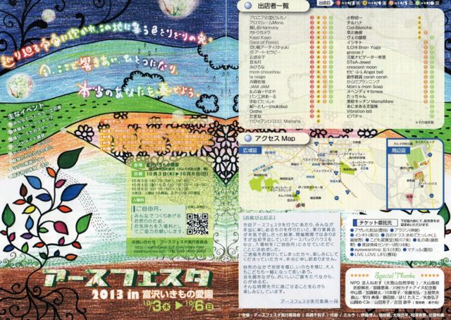 ********************** 巡り廻る宇宙に抱かれ、 この地に集う色とりどりの光。 今、ここで響きあい、ひとつになり、 本当のあなたを奏でよう。 ********************** 今年もアースフェスタが始まります。 自然の流れの中で、全てが廻り巡るお祭り。 各々の色で輝き、それぞれの響きで表現し、全ての繋がりを共鳴させます。 この祭りにドキドキを感じ、自分自身も輝き、全てと繋がりたい人が現れるのを待っています。 1つの山を使い、地球の縮図をこの空間に表現します。 老若男女