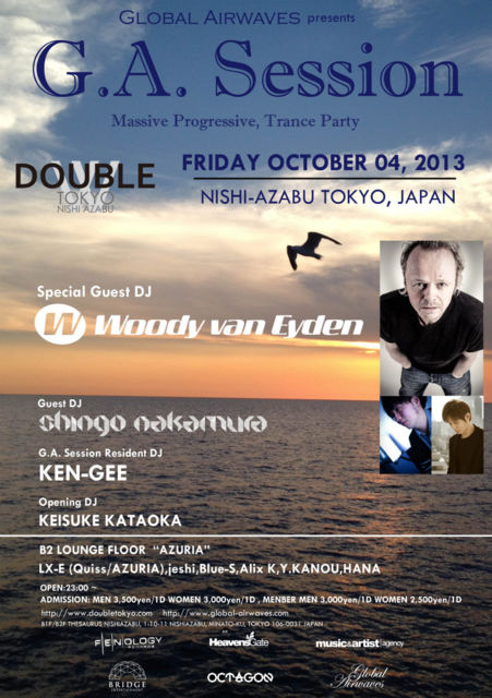 ÆüËܹñÆâ¤ÎTrance¥·¡¼¥ó¤Ë¤ª¤¤¤ÆÄ¹¤¤ËÅϤêageHa BOX¡¢water¤ÇÀ¹¤ê¾å¤¬¤ê³¤±¤Æ¤¤¤ëGlobal Airwaves¡£ ¤½¤ÎGlobal Airwaves¤¬¡¢DJ KEN-GEE¤ò¥ì¥¸¥Ç¥ó¥·¡¼¤Ë¹ñÆâ³°¤ÎÍÍ¡¹¤Ê¥¢¡¼¥Æ¥£¥¹¥È¡¢DJ¡¢¥¯¥é¥Ö¤È¥³¥é¥Ü¤¹¤ë¥Ñ¡¼¥Æ¥£¡ÖG.A. Session¡×¤òÀ¾ËãÉÛDouble¤Ç»Ïư¤µ¤»¤ë¡£ Â裱²óÌܤÎ10/4¡Ê¶â¡Ë¤Ï¡¢Double Tokyo Wolrd Conection¤È¤·¤Æ´Ú¹ñ¹¾Æî¤Î¿Íµ¤¥¯¥é¥ÖOctagon (DJ mag¥¯¥é¥Ö¥é¥ó¥¥ó¥°12°Ì)¤È¥Ñ¡¼¥È¥Ê¡¼¥·¥Ã¥×¤ò·ë¤ÓÀ¹Âç¤Ë³«ºÅ¡£µÇ°¤¹¤Ù¤Âè°ìÃÆ¤Ï¥ª¥é¥ó¥À½Ð¿È¥¤¥Ó¥¶ºß½»¤ÎÂçʪ¥È¥é¥ó¥¹¥¢¡¼¥Æ¥£¥¹¥ÈWoody Van Eyden¤ò¾·æÛ¡£ÈबΩ¤Á¾å¤²¤¿¥°¥í¡¼¥Ð