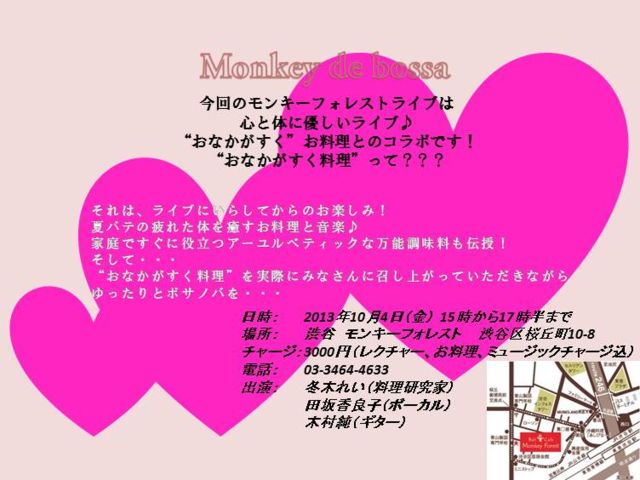 ¡Á¿´¤ÈÂΤˤ䤵¤·¤¤¥é¥¤¥Ö¡Á º£²ó¤Î¥â¥ó¥¡¼¥Õ¥©¥ì¥¹¥È¥Ü¥µ¥Î¥Ð¥é¥¤¥Ö¤Ï¡¢¤ªÎÁÍý¤È¥³¥é¥Ü¡ª ÌôÁ·ÎÁÍý¸¦µæ²È¤ÎÅßÌÚ¤µ¤ó¤¬²ÈÄí¤Ç¤¹¤°¤ËÌòΩ¤Ä¥Ø¥ë¥·¡¼¤Ê¥ì¥·¥Ô¤ò¾Ò²ð¤·¤Æ¤¯¤À¤µ¤¤¤Þ¤¹¡£ ¤½¤·¤Æ²Æ¥Ð¥Æ¤·¤¿ÂΤˤ䤵¤·¤¤¤ªÎÁÍý¤ò»î¿©¤·¤Æ¤¤¤¿¤À¤¤Ê¤¬¤é¡¢¥Ü¥µ¥Î¥Ð¤Ç¿´¤Ë¤â¤ä¤µ¤·¤¤»þ´Ö¤ò¡¦¡¦¡¦ Æü»þ¡§10·î4Æü¡Ê¶â¡Ë15»þ¤«¤é¡¡17»þȾ¤Þ¤Ç ¾ì½ê¡§½Âë¥â¥ó¥¡¼¥Õ¥©¥ì¥¹¥È¡¡03-3464-4633 http://www.monkey-forest.jp/ ¥Á¥ã¡¼¥¸¡§3000±ß¡Ê¥ì¥¯¥Á¥ã¡¼¡¢»î¿©¡¢¥ß¥å¡¼¥¸¥Ã¥¯¥Á¥ã¡¼¥¸¹þ¡¡¡¡¡¡¡¡¡¡¡¡¡¡¡¡¡¡¡¡ ¥ì¥¯¥Á¥ã¡¼¡§ÅßÌڤ줤http://fuyuki-l