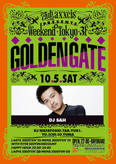 10/5(SAT)GOLDEN GATE@axxcis ★★★★★ エントランスにて「ユキのゲストでアクシス」とお伝え頂ければ、何名様でもゲスト料金にてご入場頂けます! お気軽にご利用ください!! ★★★★★ ☆☆☆☆☆ または、メッセージ頂ければ個別のゲストもお取り致します! 代表者名とだいたいの人数を直接メッセージください! 折り返しメッセージ致します!! ☆☆☆☆☆ ※ゲスト料金※ 24時までに入場→男性1000円/0D、フリー 24時以降に入場→男1500円/1D 、女性フリー ■2013/10/05(sat.) WEEKEND TOKYO@渋谷AX
