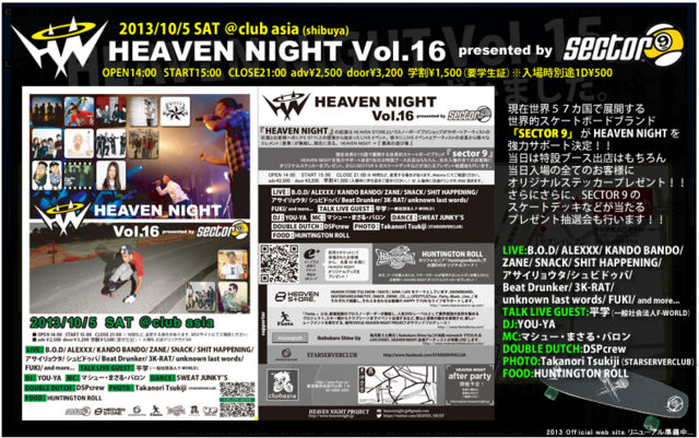 Fantasista moviesでお馴染みのアーティスト達が集合します! DVDで耳にしたお馴染みアーティストがこれだけ揃います!まさに、Fanta.な夜でもあります!試写会イベントでも、これだけの数は難しいですよね。映像をしっかり目に焼き付けて、渋谷へ集合です! 当日払いOKの前売りIDを発行します!ご希望の方は参加人数を添えて、書き込みをお願いします! ■HEAVEN NIGHT vol.16 ■OPEN 14:00 START 14:30 CLOSE 21:00 ■adv ¥2,500 door ¥3,200 ※入場時に別途ドリンク代¥500を頂きます。 ■場所:club asia HP:http://asia