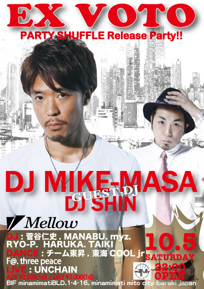 ´ÉÍý¿ÍÍ͹ðÃμºÎ餤¤¿¤·¤Þ¤¹¡£ ¢£2013.10.5(Sat) 22:00open [EX VOTO] PARTY SHUFFLE RELEASE PARTY!! All Mix ¡õ Show Case GUEST DJ> DJ MIKE-MASA. DJ SHIN DJ> ¿ûë¿Î»Ë.TOKU. MANABU. myz. HARUKA. TAIKI LIVE> UNCHAIN DANCE> ¥Á¡¼¥àÅ쾺. Å쳤COOL jr. F@. three peace FEE: ADV \2.500(1d) : DAY \3.000(1d) ¢£DJ MIKE-MASA 1998ǯ¤è¤êDJ³èư¤ò³«»Ï¡£°ÊÍè¡¢Èब»ý¤ÁÈ÷¤¨¤ë"Îतµ©¤Ê¤ëÁª¶Ê¥»¥ó¥¹¤ÈÈ´·²¤ÎMIXµ»½Ñ"¤òÉð´ï¤Ë¡¢½Ö¤¯´Ö¤Ë³èÌö¤Î¾ì¤òÅÔÆâ³Æ½ê¤«¤éÁ´¹ñ¤Þ¤Ç¤Ë¹¤²¡¢R&B¤ò¼´¤È¤·¤Ê¤¬¤é¤â¥¸¥ã¥ó¥ë¤Ë¤È¤é¤ï¤ì¤Ê