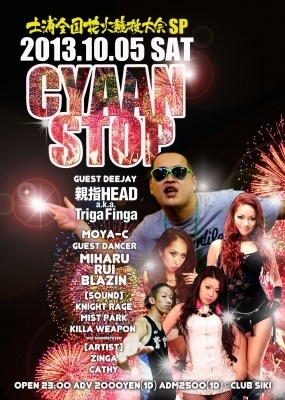 10.05sat ¡ÚCYAAN STOP¡ÛÅÚ±ºÁ´¹ñ²Ö²Ð¶¥µ»Âç²ñSP GUEST DEEJAY ¿Æ»ØHEAD aka Triga Finga MOYA-C GUEST DANCER MIHARU RUI BLAZIN` SOUND MIST PARK KNIGHT RAGE KILLA WEAPON DeeJae ZINGA CATHY and more... ADV 2000yen(1D) ADM 2500yen(1D) OPEN 23:00 @ClubSIKI °ñ¾ë¸©ÅÚ±º»ÔÀî¸ý£±¡Ý£±£±¡Ý£µ¡Ê£³F¡Ë