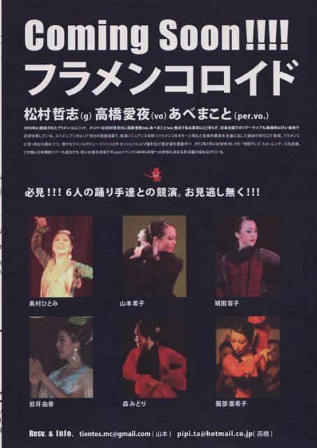 ¢£10·î5Æü(ÅÚ)¡¡ÅìµþFLAMENKOROID LIVE open17:30/start18:00/ sitting /adv¡ï3500 door¡ï4000(¤È¤â¤Ë¡Ü1drink¡ï500) standing/adv¡ï1800 door¡ï2500(¤È¤â¤Ë¡Ü1drink¡ï500)¡¡ Live¡§ÅìµþFLAMENKOROID ¡õ bailaora de Kyoto(µþÅÔ¤ÎÍÙ¤ê¼ê) ¢öFLAMENKOROID 2010ǯ¤Ë¿Íµ¤¡¦¼ÂÎ϶¦¤Ë¥È¥Ã¥×¥¯¥é¥¹¤Î3¿Í¤Ç·ëÀ®¤µ¤ì¤¿¥Õ¥é¥á¥ó¥³¥æ¥Ë¥Ã¥È¡£¥á¥ó¥Ð¡¼¤Ï¾¾Â¼Å¯»Ö(G)¡¢¹â¶¶°¦Ìë(Vo)¡¢¤¢¤Ù¤Þ¤³¤È(Vo)¡£µòÅÀ¤Ç¤¢¤ëÅìµþ¤Ë¤È¤É¤Þ¤é¤º¡¢ÆüËÜÁ´¹ñ¤Ç¤Î¥Ä¥¢¡¼¥é¥¤¥Ö¤âÀѶËŪ¤Ë¹Ô¤¤³ÆÃϤǹ¥É¾¤òÇ¤Æ¤¤¤ë¡£¥¹¥Ú¥¤¥ó¡¢¥¢¥ó¥À¥ë¥·¥¢ÃÏÊý¤Î̱¯²»³Ú¤Ç¡¢±ü¿¼¤¤¥Ë¥å