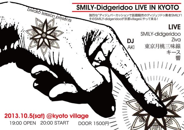 ÈüÇʸХ»¥Ã¥·¥ç¥ó¥×¥ì¥¼¥ó¥Ä SMILY-didgeridoo IN KYOTO ¶¯Îõ¤Ê¡É¥Ç¥£¥¸¥å¥Ñ¡¼¥«¥Ã¥·¥ç¥ó¤ÇÏÃÂêÁûÁ³¤Î¥Ç¥£¥¸¥å¥ê ¥É¥¥ÁÕ¼ÔSMILY¡ª ¤½¤ÎSMILY-didgeridoo¤¬µþÅÔvilla ge¤Ë¤ä¤Ã¤ÆÍè¤ë¡ª ·Þ¤¨¤ë¤ÏµþÅÔ¤ÎÀ¨ÏÓÁÕ¼Ô¤ÎÌÌ¡¹ º£¾¬¡¢¤É¤ó¤Ê¥³¥é¥Ü¥ì¡¼¥·¥ç¥ó¤¬ÂԤäƤ¤¤ë¤Î¤«¡ª¡©¡© ¥Ç¥£¥¸¥å¥ê¥É¥¥¤¬¹¥¤¤Ê¿Í¤â¡¢¥»¥Ã¥·¥ç¥ó¹¥¤¤Ê¿Í¤â¤ß¤ó ¤Ê¤Ç³Ú¤·¤ß¤Þ¤·¤ç¤¦¢ö... ÅöÆü¡¢¥»¥Ã¥·¥ç¥ó»²²Ã¤âÂç´¿·Þ¤Ç¤¹¡ª LIVE SMILY-didgeridoo Åìµþ·îÅí»°Ì£Àþ ¥¡¼¥¹ Ziva ¶Á DJ AKI FLYER DESIGN ÉâÍ·¥«¥²¥í¥¦ 1500±ß Natural food village