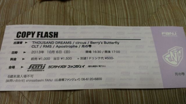 2013年10月6日 心斎橋FANJ 1stLive! 会場:心斎橋FANJ http://www.s-fanj.com/map.html 開場:16時半 開演:17時 出番:19時半近く(他のバンドさんはGLAY,J-Pop系みたいです) チケット:前日¥1000 当日¥1500 +別途1ドリンク¥500 今回のLiveですがセットリストがマニアック&初Liveという事もありますので、 上記の値段書いていますが無料でご招待させて頂きたく思います。 来ていただける方はコメント又は私宛にメッセージお願い致します。 尚、別途の1drinkはご負担お願い致します。 セットリ