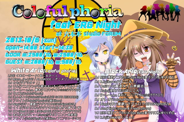 管理人様、告知失礼します。 TCPTpresents アニソン&声優&アーティスト系クラブイベント 2013/10/6 Coloful Phoria feat.ERG Night -Song for A-POP ALL Mix- @ 六本木studio FORUM 2013/10/6(Sun) 14:30〜21:00 open14:00 start14:30 Door2500YEN(1D) 【ディスカウントは各DJ.VJ.スタッフ、又はTwitterメインはTweetVite&mixiメインはmixiコミュニティの参加表明&TCPTディスカウント&フライヤーで男性2000YEN(1D) そして、今回も毎回好評な女性無料キャンペーンをやっちゃいます! 1週間前までに各種参加