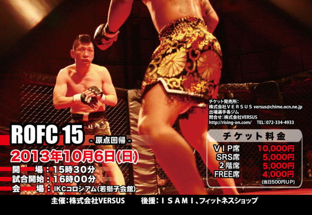 ROFC15−原点回帰− 日時:2013年10月6日(日) 開場:15時30分 試合開始:16時00分 会場:IKCコロシアム(若獅子会館) 〒546-0022 大阪市東住吉区住道矢田6−5−19 06−6702−8445 主催:株式会社VERSUS 後援:ISAMI、フィットネスショップ チケット料金:VIP席10,000円/SRS席5,000円/2階席5,000円/FREE(自由)席4,000円(当日500円UP) チケット発売所: 株式会社VERSUS 出場選手各ジム 問合せ:株式会社VERSUS http://rising-on.com/ 072-334-4