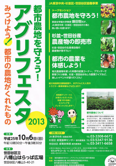 まだまだ秋祭りは続きますよ〜♪ 【都市農地を守ろう!〜アグリフェスタ2013〜みつけよう!都市の農地がくれたもの】 10/6 10:30〜15:30 世田谷区立八幡山はらっぱ広場にて(世田谷区八幡山3-40-21)にて 世田谷区や杉並区の農業委員会の企画なので、チラシは硬いイメージですが‥(^^;) 大道芸やプランターで野菜作り体験、農業クイズ、トラクター乗車体験、模擬店などなど、子連れで楽しめる企画満載です♪... もちろん!イルソーレも美味しいご飯の販売とゲームコーナー設けますのでお楽しみに〜♪ http://www.city.setagaya.lg.