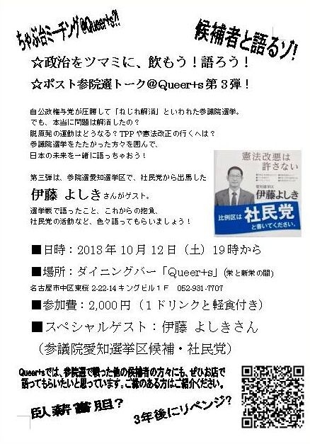 政治をツマミに、飲もう!語ろう!ちゃぶ台ミーチング@Queer+s?! ポスト参院選トーク@Queer+s 自公政権与党が圧勝して「ねじれ解消」といわれた参議院選挙。 でも、本当に問題は解消したの? 脱原発の運動はどうなる?TPPや憲法改正の行くへは? 参議院選挙をたたかった方々を囲んで、 日本の未来を一緒に語っちゃおう! 選挙戦で語ったこと、これからの抱負や活動など、色々語ってもらいましょう! 第2段!尾形恵子さん(緑の党・参院選全国比例候補者) 日時:2013年10月6日(日)19時から https://www.facebook.com/events/190208884