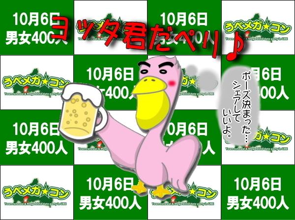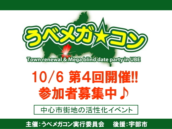 ★第4回うべメガコン★ 【10/6】宇部市で男女400人の街コンを開催! 宇部新川周辺の居酒屋を巡り、飲み放題&料理を楽しみながらの合コンコミュニケーションです♪ このイベントは中心市街地の活性化を目的に開催されています。 ●オフィシャルサイト(申込み) http://tjico.jimdo.com/ ●facebookページ http://www.facebook.com/ubemegakon ■主催:うべメガコン実行委員会 ■後援:宇部市