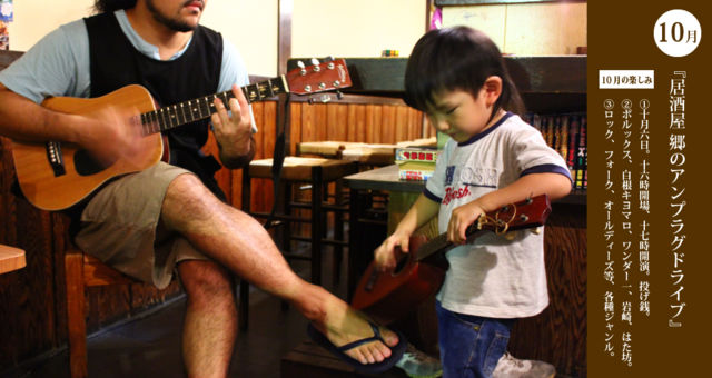@アンプラグドライブ 日時 10/6(sun) 場所 居酒屋郷 〒500-8408 岐阜市住之江町1−18ー3藤村ビル2F 058-263-3316 出演 :ポルックス :白根キヨマロ :ワンダー1(ワイマンズ) :岩崎(type-B) :ハタ坊(Birds in the sky) open16:00 / start17:00 /close23:00