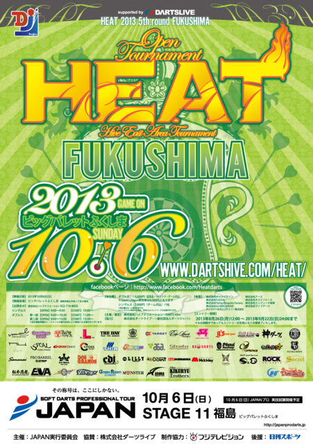 『HEAT 2013 5th.round FUKUSHIMA』 【開催日】2013年10月6日(日) 【開催会場】ビッグパレットふくしま 〒963-0115 福島県郡山市南二丁目52番地 【主催】株式会社ハイブクリエーション 【協力】株式会社ダーツライブ 【開始時間】 シングルス 受付9:00〜9:50 試合開始10:00〜 ダブルス 第1部 受付9:00〜10:30 試合開始11:00〜 第2部 受付9:00〜13:00 試合開始13:30〜 ※試合開始時間はトーナメントの進行状況により変動する場合がございます。 【受付期間 】 2013年8月26日(月)12:00〜2013年9月2