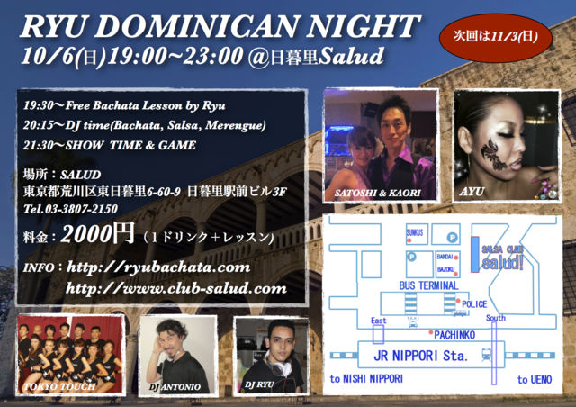 ★RYU's DOMINICAN NIGHT @日暮里SALUD ★ ドミニカ共和国発祥のバチャータとメレンゲをたっぷり楽しめるイベントです! もちろんサルサもマンボもかかります! RyuセレックションのバチャータとメレンゲMIX CDは20名にプレゼント! 早い者勝ち!NO FALTES! ◆日時:10月6日(日)19:00-23:00 ◆場所:SALUD 東京都荒川区東日暮里6-60-9 日暮里駅前ビル3F Tel.03-3807-2150 ◆料金:2000円(1ドリンク+レッスン) =================================================== タイムテーブル 19:00〜Open 19:30〜Free Bach