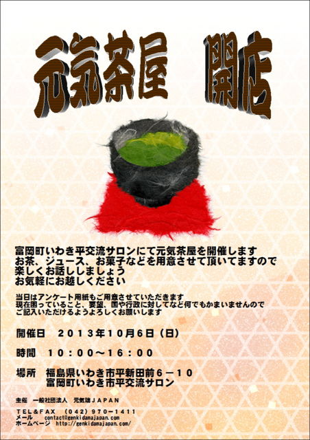 開催日 2013年10月6日(日) 時間 10:00〜16:00 場所 福島県いわき市平新田前6−10 富岡町いわき市平交流サロン