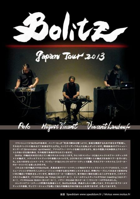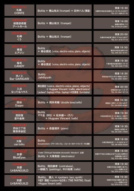 ■10月6日(日) VVAV Virtual Variable Acoustic Vendor open・start18:00/adv¥1500 door¥1800(+1drink¥500) Live:Route09 / dagshenma / Unyo303 / Bolitz 仮想可変音響ベンダー。 本イベントは、関西を中心にエレクトロ・アコースティックからエレクトロニカ、ノイズまで幅広く活動するRoute09が、フランスの電子音楽ユニット「Bolitz」の来日ツアーの京都公演として開催する。 また、shrine.jpやHz-Recordsよりリリースを重ね、ノイズ専門レーベルUnnoiselessを主宰する「dagshenma」、アナログモジュールシンセを駆使したパフ